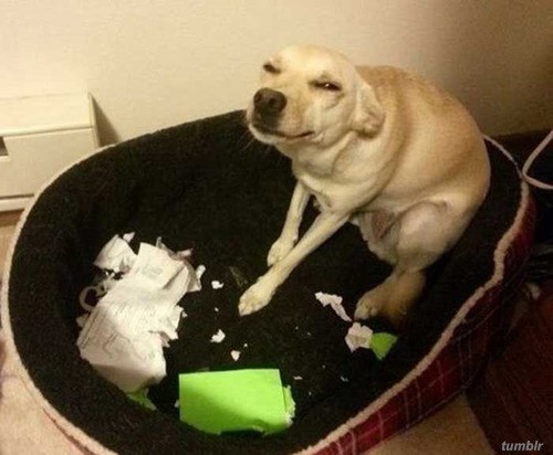 공개된 사진에는 갈기갈기 찢어진 노트와 잔뜩 움츠리고 있는 개 한 마리의 모습이 담겨 있다. 제목을 봤을 때 이 개는 주인이 숙제한 노트를 찢은 것으로 보인다.