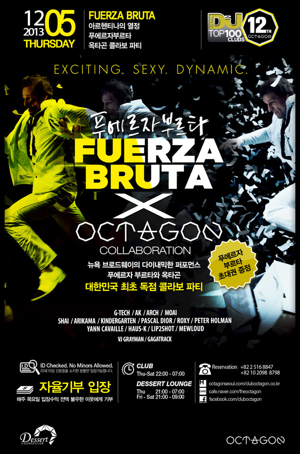 신선하고 독특한 공연으로 젊은 관객층을 사로잡은 <푸에르자 부르타>는 월드클래스 TOP 12위에 랭크된 서울에서 가장 영향력 있는 클럽, 옥타곤과의 콜라보파티. 관련업계 관계자는 “무대와 객석을 경계를 허문 독특한 공연답게 클럽이라는 자유롭고 트랜디한 장소에서 새로운 관객층을 공략하는 좋은 본보기”라고 말했다.