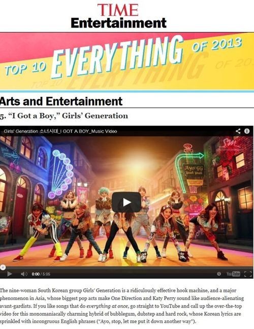 소녀시대는 [아이 갓 어 보이](I Got a Boy)로 5위에 올랐으며, 아시아권 가수로서는 유일하게 선정됐다. 타임지는 “9명으로 구성된 한국 그룹 소녀시대는 후크송으로 엄청난 효과를 낸 팀이며 아시아에서 이미 메이저급으로 자리 잡았다”고 평했다.