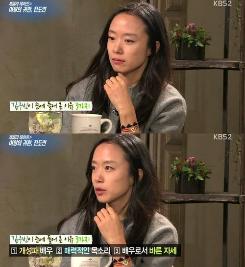 이날 전도연은 최근 가장 눈이 가는 후배 남자 배우로 김우빈을 꼽았다. 이에 리포터 김태진은 눈에 들어온 3가지 이유를 설명해달라고 말했다.