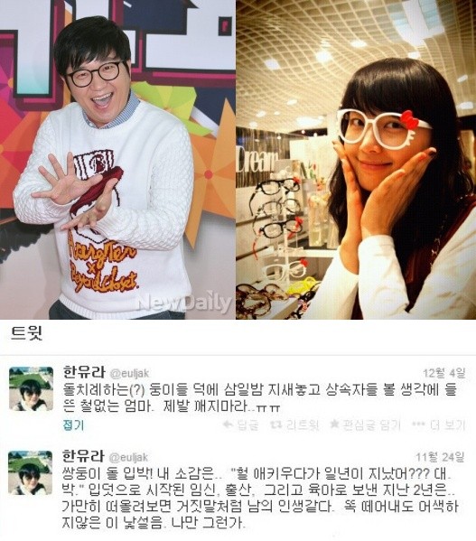 또한, 한유라는 12월 4일 “돌치레하는 쌍둥이들 덕에 삼일 밤 지새놓고 상속자들 볼 생각에 들뜬 철없는 엄마. 제발 깨지 마라”라는 글을 게재해 눈길을 끌었다.