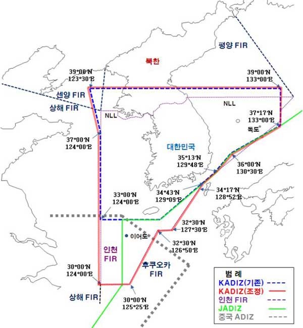 인근 FIR과 일치시키는 형태로 조정했다.새로운 KADIZ는 관보와 항공 고시보를 통한
