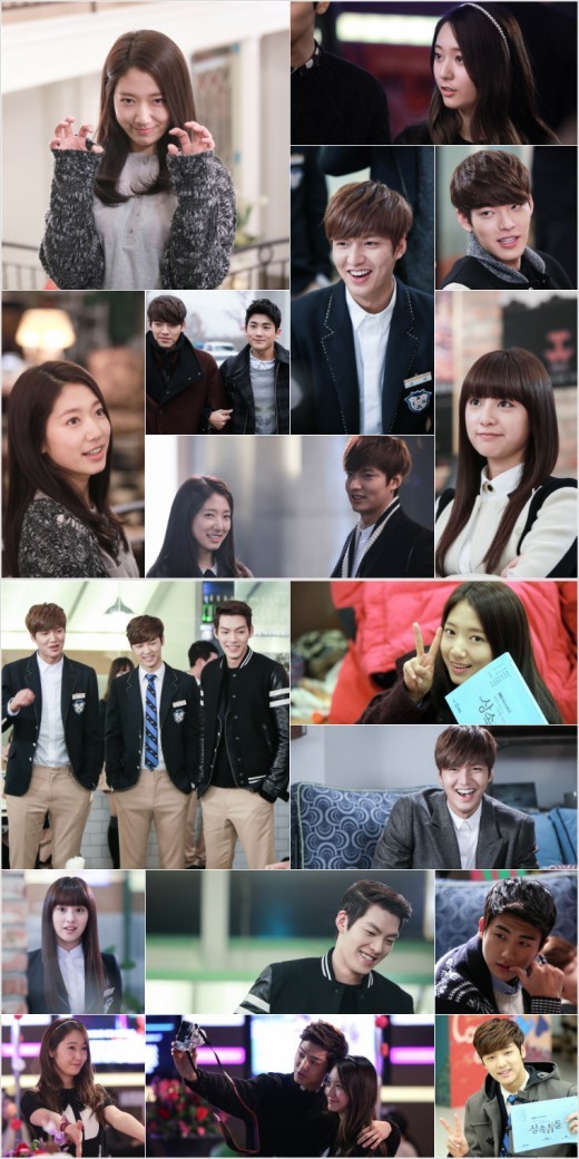 <상속자들> 배우들의 촬영장 비하인드 컷이 공개됐다.이민호 박신혜 김우빈 정수정 강민혁 김지원 박형식 강하늘 등 SBS 수목드라마<상속자들>(극본 김은숙, 연출 강신효) 출연 배우들의 막바지 촬영 모습이 포착돼 눈길을 끈다.