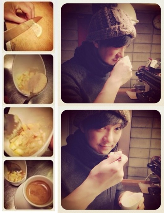 공개된 사진 속 윤건은 직접 레몬을 다듬고, 완성된 카페로망을 음미하는 모습이 담겨 있다.