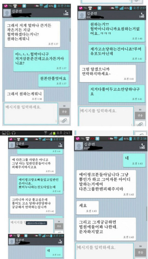 또한, 김준면이라는 상대방은 “에이핑크 멤버가 아니니 피해 주지 말라. 고소할 지는 두고 보멸 알 것”고 당부하고 있다.