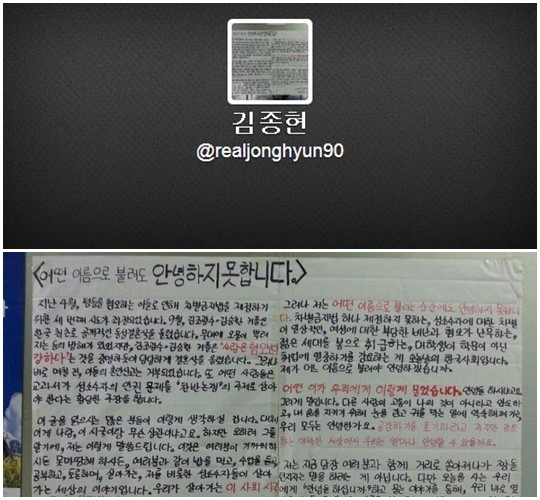 그룹 샤이니 종현이 자신의 트위터 프로필 사진을 [안녕하지 못합니다] 대자보로 설정했다.15일 종현의 트위터 프로필 사진은 성공회대학교 사회과학부 강은하 씨가 직접 작성한 “어떤 이름으로 불려도 안녕하지 못합니다” 대자보 전문으로 교체돼 있다.