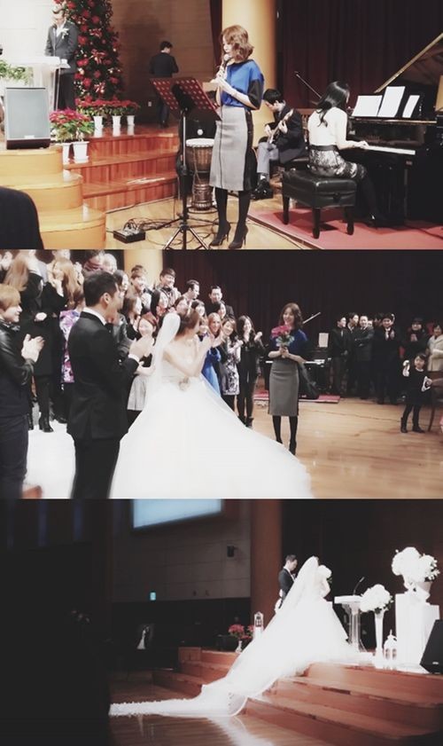 공개된 사진 속 윤은혜는 자두가 던진 것으로 보이는 부케를 들고 있거나 축가를 부르기 위해 마이크를 잡고 있는 모습이 눈길을 끈다.