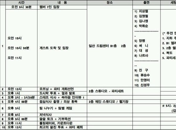 공개된 사진에는 <쓸친소> 큐시트로 보이는 스케줄표가 담겨 있다. 큐시트에는 촬영 장소부터 시간대별 스케줄이 상세하게 적혀 있어 눈길을 끈다.