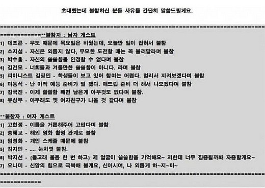특히, 내용을 보면 과거 연인이어던 유상무, 김지민의 불참사유가 눈길을 끈다. 유상무는 “아무래도 옛 여자친구가 나올 것 같다”고 밝혔고, 김지민은 “눈치껏 불참”이라는 이유가 적혀 있다.