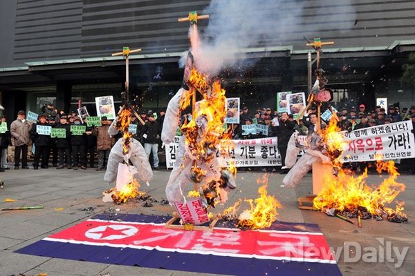 [포토]불타는 김일성-김정일-김정은, '놈놈놈'