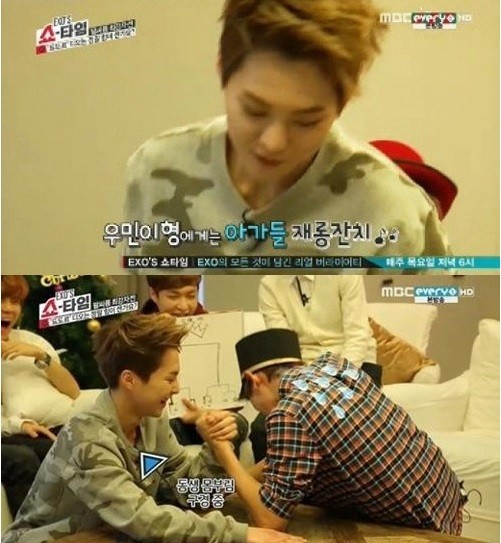 그룹 엑소의 시우민이 멤버들 간 팔씨름 대결에서 1위를 차지했다.지난 19일 방송된 MBC 에브리원 '엑서의 쇼타임(EXO's Show Time)'에서는 '도료르라는 별명이 있는 디오, 정말 12명 중 힘이 센가요?'라는 팬의 질문에 답하기 위해 엑소 멤버들간의 팔씨름 대결을 진행했다.이날 팔씨름 대결에 앞서 백현은 "항상 쓰던 손은 단련이 됐으니까 센 거고 왼손은 태생부터 쓰지 않았던 파워니까 왼손을 써보자"고 제안했다.이에 멤버들은 시우민을 강력한 우승후보로 꼽았다. 시우민은 멤버들의 기대를 저버리지 않고 1라운드부터 손쉽게 승리하는 모습을 보였다.특히 시우민은 "재미있게 하자"며 일부러 쉽게 이기지 않고 상대방의 몸부림을 구경하는 등 여유로운 모습을 보였다.결국 모든 멤버를 이긴 시우민이 엑소 내에서의 팔씨름 최강자 타이틀을 거머쥐게 됐다.반면 찬열은 어차피 질 거라는 생각에 모양새가 덜 빠지는 자세를 고민하는 모습을 보여 시청자들에게 큰 웃음을 선사했다.또한 크리스는 수호와 찬열에게 허무하게 지고 꼴찌에 등극했다. 크리스는 "한 번만 이겨보자" "너무한다 정말"이라며 하소연해 멤버들을 폭소케했다.한편, 이날 방송을 접한 네티즌들은 "아 엑소 너무 좋다" "시우민 의외인데?" "얼굴은 귀여운데 상남자" "시우민 귀여운 얼굴과 달리 헐크네" "시우민 너무 좋아" "엑소 흥해라" 등의 반응을 보였다.[사진 출처=MBC 에브리원 '엑소의 쇼타임' 방송화면 캡처]