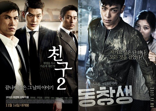 영화 <친구2>는 곽경택 감독의 2001년 영화 <친구>의 후속작으로 약 300만명의 관객을 동원했다. 동수(장동건)을 살인 교사한 혐의로 17년 동안 감옥에 있었던 준석(유오성)은 감옥에서 나와 조직을 재건하는데 힘쓴다. 그의 오른팔인 성훈(김우빈)은 감옥에서 만난 준석은 믿고 의지하며 조직을 키우는데 힘을 보탠다.