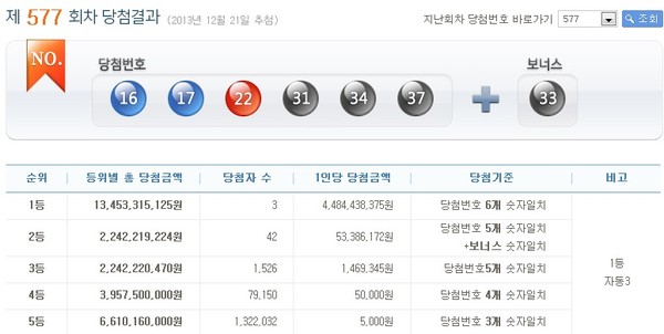 2013년 12월 21일 실시된 제577회 나눔로또 1등 당첨번호는 ‘16, 17, 22, 31, 34, 37’이며, 2등 보너스 번호는 33번이다.