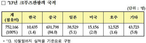 크루즈 관광객의 84%인 63만여 명이 중국인이다.