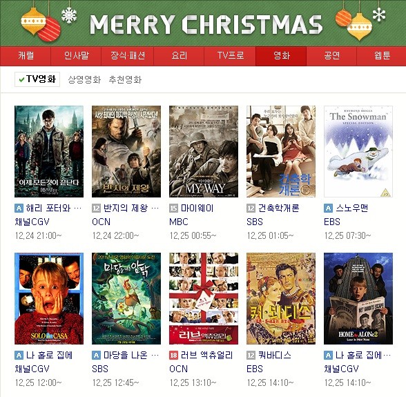 성탄절이 다가옴에 따라 성탄절 특선 영화에 대한 관심이 높아지고 있따.이번 성탄절 특선 영화는 케이블 TV에서 주로 상영될 예정이다. 우선 지상파에서 상영되는 영화를 살펴보면 다음과 같다.SBS에서는 낮 12시 45분 어린이들을 위한 애니메이션 '마당을 나온 암탉'을 방영하며, 새벽 1시 5분에는 첫사랑 열풍을 불러일으켰던 영화 '건축학 개론'을 내보낸다.MBC에서는 밤 12시 55분 장동건 주연의 전쟁영화 '마이웨이'가 방송될 예정이며, KBS 2TV 에서 24일 오후 11시 5분 뱀파이어의 사랑이야기를 담은 '이클립스-트와일라잇 세번째 신화'가 방송된다.EBS에서는 24일 오후 11시 40분 명작 로맨틱 코미디 '해리가 샐리를 만났을 때'가 전파를 탄다. 크리스마스 당일인 25일 오후 4시 15분에는 '라이온 킹'이 편성됐다.그 밖에 채널 CGV에서는 '해리포터' 시리즈 전편이 24일 내내 방송될 예정이라 많은 솔로들에게 즐거움을 줄 것으로 생각된다.또 최고의 성탄절 특선영화로 꼽히는 '나홀로 집에'는 크리스마스 당일 채널 OCN을 통해 오전 11시에 만나 볼 수 있으며, 채널 CGV에서는 이날 오후 12시 40분 '나홀로 집에3'이 방송된다.OCN에서는 '나홀로 집에' 외에도 24일 오후 10시에 '반지의 제왕'과 로맨틱 코미디 영화의 대명사 '러브 액츄얼리'를 오후 1시 10분에 방영한다.[사진 출처=네이버 성탄절 특선영화 캡처]