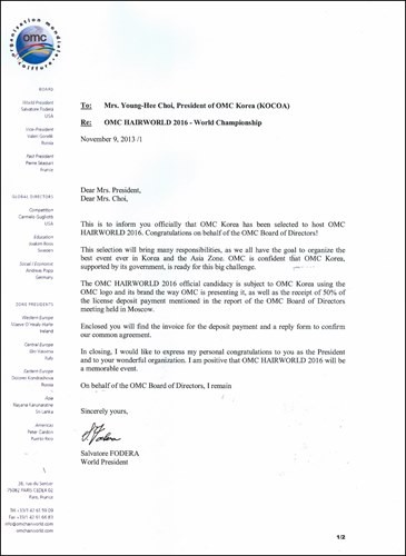 지난달 11일 OMC(세계이미용협회) 본부로부터