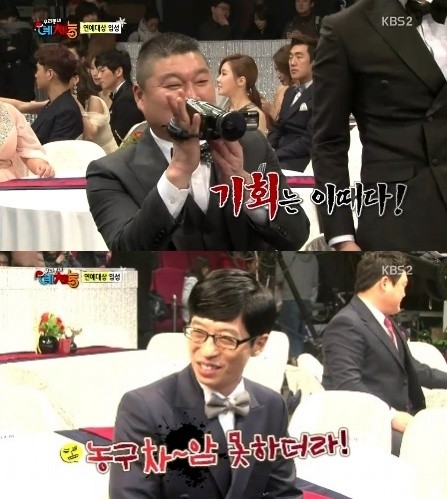 유재석이 강호동의 농구 실력에 거침없이 돌직구를 날렸다.지난 24일 방송된 KBS 2TV <우리 동네 예체능>에서는 [2013 KBS 연예대상]에 참석한 예체능 멤버들의 모습이 그려졌다.