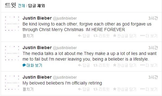 (My beloved beliebers i'm officially retiring. The media talks a lot about me. They make a up a lot of lies and want me to fail but i'm never leaving you. being a beliebers is a lifestyle. Be kind loving to each other, forgive each other as god forgave us through Christ Merry Christmas. I'M HERE FOREVER)"