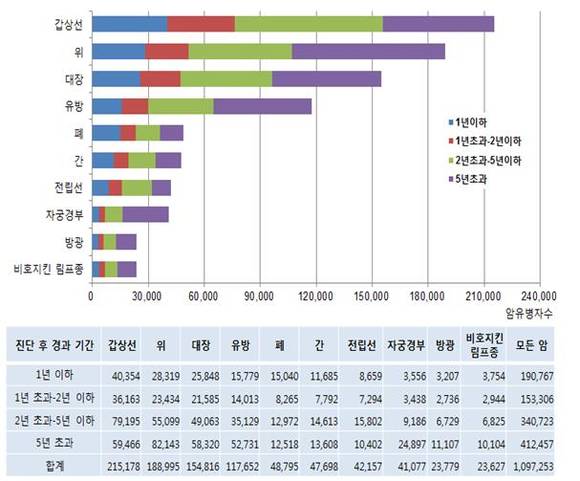 간암(28.6%), 폐암(20.7%), 췌장암(8.7%)은 상대적으로 매우 낮았다.< 2011년 주요 암종의 진단 후 경과 기간별 암 유병자수 >