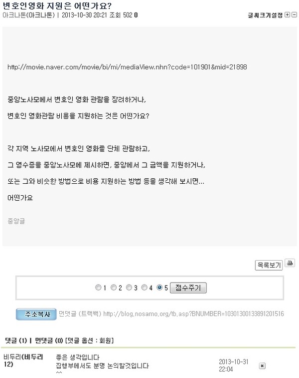 변호인 영화관람 비용을 지원하는 것은 어떻겠느냐"는 건의문을 올리기도 했다.이 네티즌의 의견대로 <중앙노사모>에서