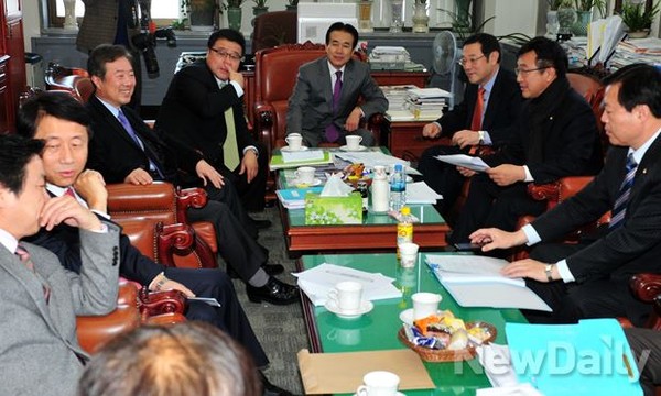 <나성린> 국회 기획재정위 조세소위 위원장 등 여야 의원들이 27일 오전 국회 기회재정위원회 조세소위원회에 앞서 쟁점 법안에 대한 의견을 조율하고 있다.