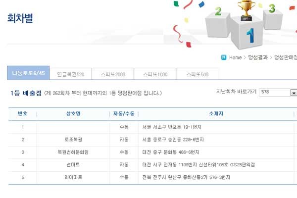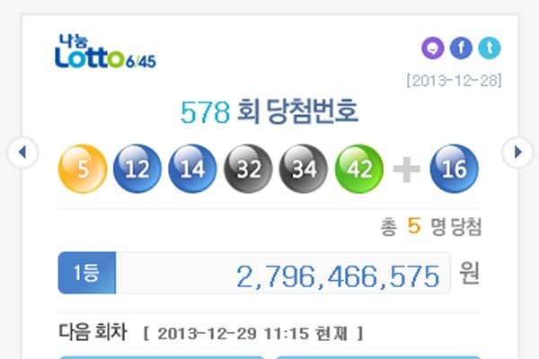 제578회 나눔로또 1등 당첨자는 5명이다.1등은 5, 12, 14, 32, 34, 42와 보너스 번호 16이다.