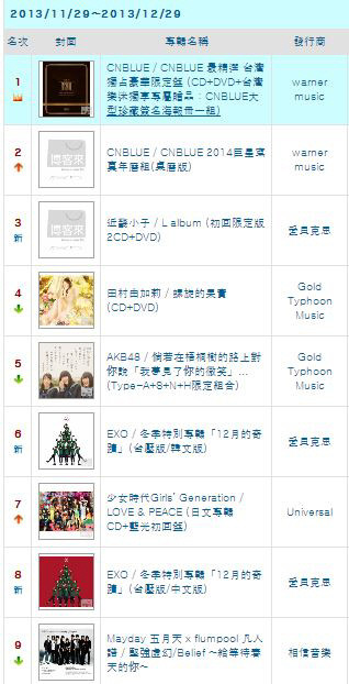 오는 1월 3일 대만 정식 발매를 시작하는 씨엔블루의 음반은 선 주문만으로 월간 차트 1위를 휩쓸며 씨엔블루의 대만 인기를 다시 한번 입증했다. 동 차트 2위에는 씨엔블루 2014 시즌 그리팅이 랭크돼 있어 눈길을 끈다.