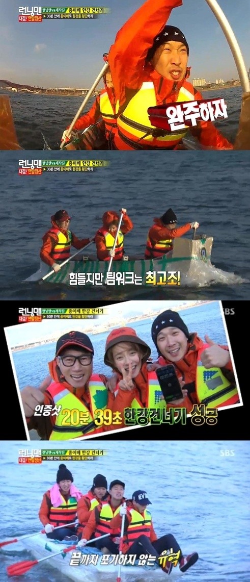 지석진, 하하, 송지효로 구성된 이들은 극적으로 3인승 배를 완성시켰고, 서로를 격려하며 열심히 노를 저어가기 시작했다. 그렇게 세 사람은 전의를 불태웠고, 결국 허술하게 보이는 종이배를 타고 20분 39초 안에 한강을 건너는 데 성공했다.