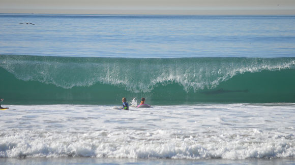 파도 속 식인상어가 포착됐다.30일(한국시각) 미국 온라인 매체 허핑턴 포스트는 미국 캘리포니아 해안가에서 서핑을 즐기는 소년 2명 뒤로 거대한 식인 상어가 포착된 사진을 공개했다.
