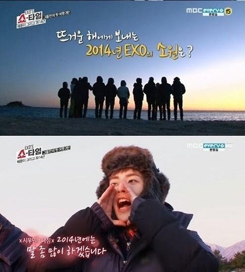 그룹 엑소의 멤버들이 '엑소 쇼타임'에서 새해 소망을 빌었다.2일 방송된 MBC 에브리원 '엑소 쇼타임' 6화에서는 새해를 맞이해 해돋이를 보기 위해 바다로 여행을 떠난 엑소 멤버들의 모습이 그려졌다.이날 방송에서 엑소 멤버들은 아름다운 해돋이를 바라보며 감탄을 금치 못했다. 엑소 멤머들은 서로 사진을 찍으며 이야기를 나누는 등 즐거운 시간을 보냈다.이후 엑소 멤버들은 해를 바라보며 신년 소원을 비는 시간을 가졌다.먼저 백현은 "엑소가 좀 더 발전했으면 좋겠다"고 빌었고, 디오는 "모두 건강했으면 좋겠다"고 새해 소망을 말했다.타오는 "내가 사랑하는 사람들이 매일 행복했으면 좋겠다"며 "나도 매일 기분 좋아야된다"라고 덧붙였다.이어 시우민은 "2014년에는 말을 많이 하겠다"고 다짐해 시청자들에게 큰 웃음을 선사했다.한편, 엑소 쇼타임 새해 소망 소식을 접한 네티즌들은 "내년엔 더 활발한 활동 부탁해요" "엑소 너무 좋아" "소원 말할 때 귀엽더라" "시우민 넘 웃기다" "우민아 내년엔 말 많이 하자" 등의 반응을 보였다.[사진 출처=MBC 에브리원 엑소 쇼타임 방송화면 캡처]