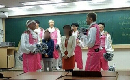 무한도전이 노량진에서 포착됐다.2일 온라인 커뮤니티 게시판에는 "무한도전 노량진 포착"이라는 제목으로 한장의 사진이 게재됐따.사진 속에는 학원으로 추정되는 곳에서 무한도전 멤버들이 분홍색 응원단복을 맞춰입고 있다.유재석의 진행아래 한 학생과 선생님이 무한도전 멤버들과 이야기를 나누고 있다.특히 길과 노홍철은 각각 손에 술을 들고 서로 마주보며 무언가를 선보이기 직전에 찍힌 사진이라 네티즌들의 궁금증을 자극한다.이는 무한도전 응원단 프로젝트 중 하나로 추정되고 있다. 해당 게시 글에 의하면 해당 학원은 노량진에 있는 학원이라고.무한도전 노량진 포착 소식을 접한 네티즌들은 "아 우리 회사에도 왔으면" "우와 저기 학원 학생들 좋겠다" "늘 열심히하는 모습 보기 좋아요" "무한도전 짱" "진짜 기운났겠다" 등의 반응을 보였다.한편, '무한도전 응원단'은 올 한해 우리나라의 각종 행사들에 참석해 응원과 함께 희망의 메시지를 전달하기 위한 장기 프로젝트다.[사진 출처=온라인 커뮤니티 게시판]
