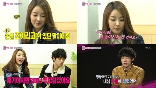 정유미가 정준영을 더 좋아하고 있는 것으로 드러나 화제다.4일 오후 방송된 MBC '우리 결혼했어요4'에는 정준영-정유미 부부가 함께 부부 상담소를 찾아 전문 상담가와 상담을 받는 모습이 그려졌다.이날 두 사람은 모래놀이와 그림 그리기 등을 통해 각자의 내면을 들여다보는 테스트를 했다.상담가는 "두 사람이 다른 것 같지만 알게 모르게 비슷한 구석이 많다"며 "정준영 씨와 정유미 씨가 서로가 지킬 건 반드시 지키고 싶어 한다"고 설명했다.또한 그림 그리기 상담에서 정유미가 손을 모으고 있는 자세를 그리자 "아내분이 남편분을 더 좋아한다"고 분석했고, 분석결과에 정유미는 당황한 미소를 보였다.이에 정준영은 웃으며 "그걸 앞에서 말하면 얼마나 쑥쓰럽겠냐"고 장난을 치면서도 기분이 좋은듯 함박웃음을 지었다.정유미는 이어 진행된 제작진과의 인터뷰에서 "내가 더 좋아하나?"라고 스스로에게 질문하더니 "모르겠다. 인정하겠다"고 솔직한 심정을 드러내 눈길을 끌었다.[사진 출처=MBC 우리 결혼했어요 방송화면 캡처]