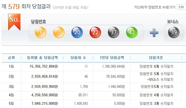 2014년 1월 4일 실시된 제579회 나눔로또 1등 당첨번호는 ‘5, 7, 20, 22, 37, 42’이며, 2등 보너스 번호는 39번이다.