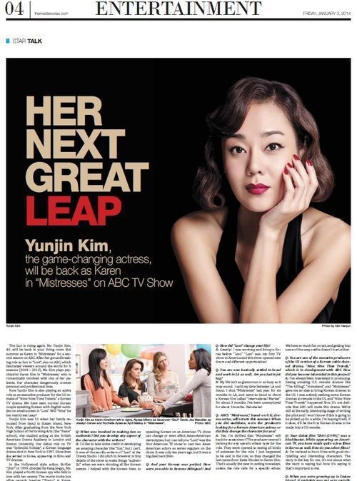 뉴욕타임즈의 기사는 시즌 2를 맞는 ABC 미국드라마 '미스트리스(Mistresses)'에서 주인공 카렌 킴 역을 맡고 있는 김윤진을 'HER NEXT GREAT LEAP(그녀의 다음 큰 도약)'이란 제목으로 소개했다.