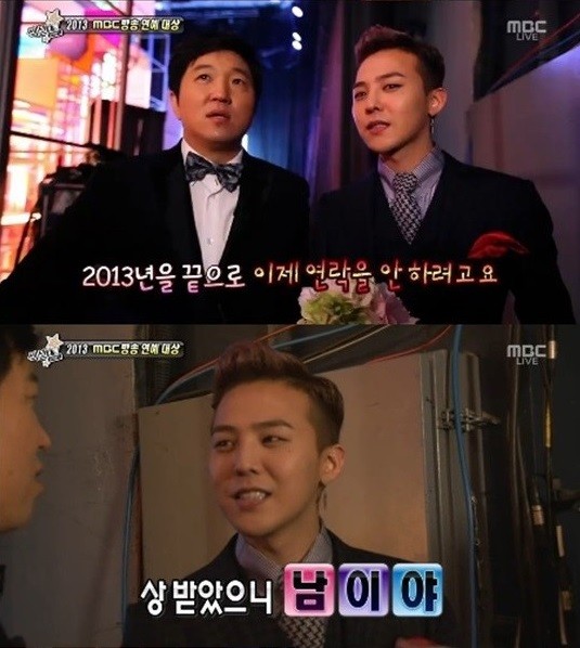 지드래곤과 정형돈의 밀당이 무대 밖에서도 이어져 화제다.5일 방송된 MBC '섹션TV 연예통신'에서는 최근 진행된 '2013 MBC 연예대상' 뒷 이야기가 전파를 탔다.이날 방송에서는 '연예대상'에서 MBC '무한도전' 가요제에서 형용돈죵 팀을 이뤄 호흡을 맞춘 정형돈과 지드래곤이 무대 뒤에서 만나 인터뷰를 나눴다.두 사람은 이날 '연예대상'에서 베스트 커플상을 수상하는 영예를 안았다.특히 지드래곤과 정형돈은 '무한도전-가요제'에서 서로에게 남다른 애정을 과시하면서도 밀당(밀고 당기기)를 멈추지 않아 시청자들에게 큰 웃음을 선사함과 동시에 큰 인기를 끌었다.이날 지드래곤은 "남자끼리 이런 상을 받아도 되나 싶다. 이것을 끝으로 연락을 안하려고 한다"며 "우린 계약 연애였다"고 말해 정형돈을 서운하게 만들었다.정형돈 또한 "이걸로 끝이지 뭐"라고 받아치며 지드래곤과 티격태격하는 모습을 보였다. 두 사람은 '무한도전'에 이어 시상식 뒷 무대에서까지 밀당을 한 것.지드래곤 정형돈 계약연애 소식을 접한 네티즌들은 "이 두사람 어쩌면 좋지?" "형용돈죵 너무좋아요" "ㅋㅋ둘이 너무 귀엽다" "둘이 저래도 친하더라" "내년에도 연속수상 노립시다" 등의 반응을 보였다.한편, 지드래곤이 속한 빅뱅은 오는 11일~13일 사흘간 오사카 쿄세라돔에서 마지막 돔 투어 공연을 앞두고 있다.