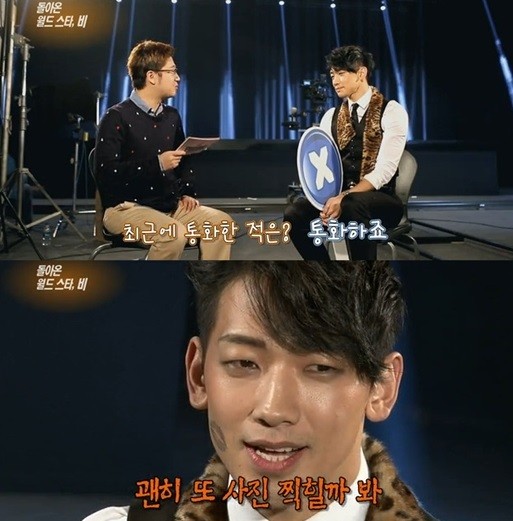 가수 비가 연인 김태희를 언급했다.지난 4일 방송된 KBS 2TV <연예가 중계>에서는 4년 만에 정규 6집 ‘레인 이펙트’로 컴백하는 비의 뮤직비디오 촬영 현장을 찾아가 인터뷰를 진행했다.
