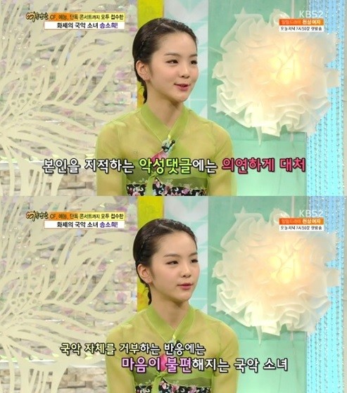 이날 송소희는 “인기가 높아져 악성 댓글에 시달리지 않느냐”라는 MC들의 질문에 “나에 대한 지적에는 크게 개의치 않는다”며 나이답지 않은 의연한 면모를 드러냈다.