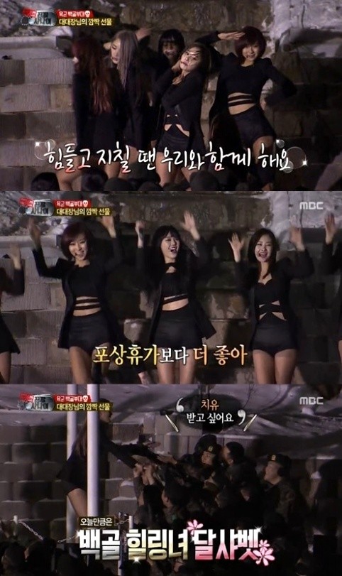 걸그룹 달샤벳이 <진짜 사나이>에 깜짝 출연해 위문 공연을 펼쳤다.지난 5일 방송된 MBC <일밤-진짜 사나이>에서는 멤버들이 백골부대에서 자대 배치를 받고 본격적으로 훈련을 받는 모습이 그려졌다.