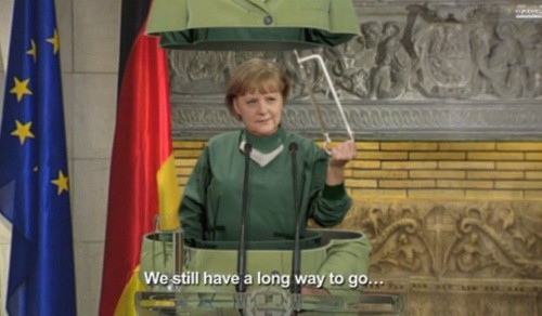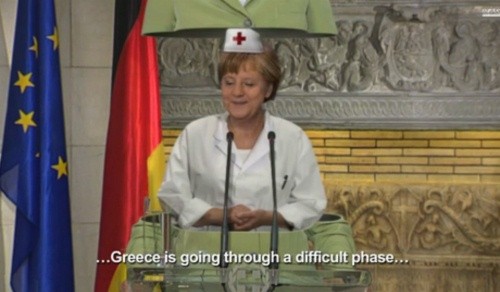 광고는 독일 총리 앙겔라 메르켈의 그리스 순방을 소재로 삼았다.