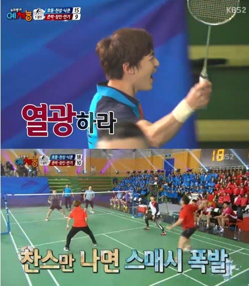 닉쿤은 코트를 날아다니다 시피 하며 숨겨왔던 배드민턴 실력으로 경기를 지켜보는 이들을 놀라게 만들었다.