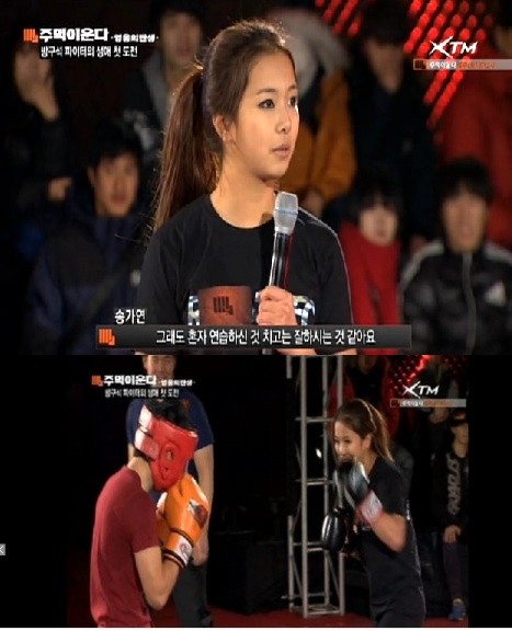 송가연은 지난 7일 송가연은 케이블채널 XTM <주먹이 운다-영웅의 탄생>에 출연해 윤형빈의 제안으로 강원도 인제에서 올라온 ‘방구석 파이터’ 정한성과 깜작 대결을 펼쳤다.