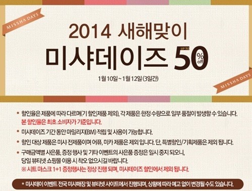 화장품 브랜드 미샤가 새해맞이 대규모 할인돌을 시작한다.미샤는 2014년 새해를 맞아 10일부터 12일까지 3일간 ‘미샤 데이즈’ 행사를 연다고 밝혔다.