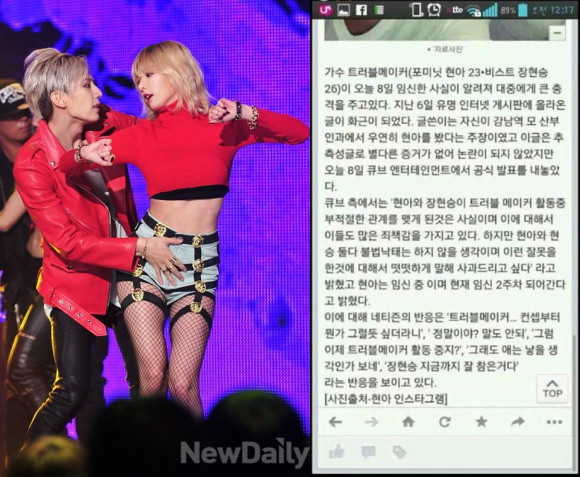이날 SNS에는 기사형식을 빌어 현아와 장현승에 대한 악성루머가 빠른 속도로 퍼졌다. 악성루머 글은 스마트폰 애플리케이션을 통해 작성된 것으로 추정된다.