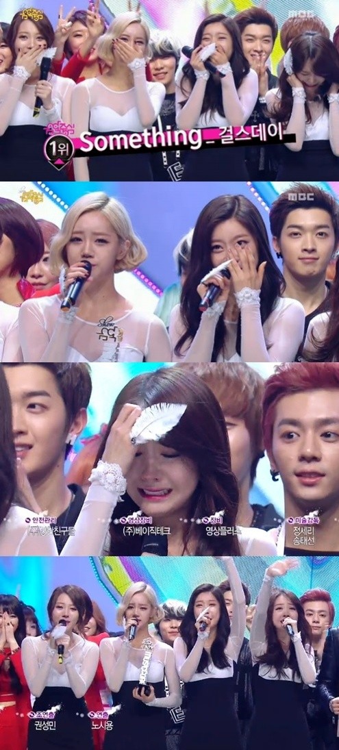 걸그룹 걸스데이(유라 혜리 소진 민아)가 <음악중심> 1위에 눈물을 펑펑 쏟았다.걸스데이는 지난 11일 방송된 MBC <쇼! 음악중심>에서 엠씨더맥스 ‘그대가 분다’, 아이유 ‘금요일에 만나요’를 제치고 ‘섬씽(something)’으로 1위에 올랐다.