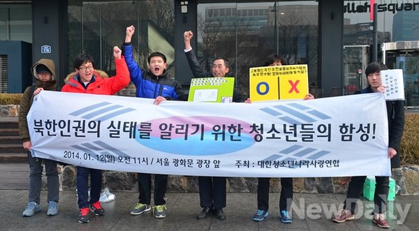 전국 각지에서 모인 대한청소년나라사랑연합 회원들이 북한 인권의 실태를 알리기 위한 기자회견을12일 오전11시 서울 종로구 세종로 광화문 KT 사옥 앞에서 진행했다.중, 고등학생으로 구성된 이들은 <북한인권법안> 제정을 요구하며북한인권문제 문제해결을 위해 적극 참여해 줄 것을 당부 했다.