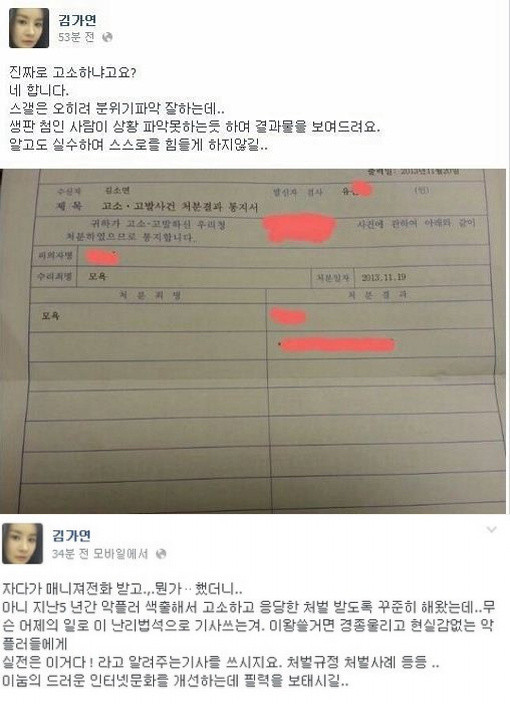 김가연은 13일 페이스북에 “진짜로 고소하냐고요? 네 합니다. 스갤은 오히려 분위기파악 잘하는데… 생판 첨인 사람이 상황 파악못하는듯 하여 결과물을 보여드려요. 알고도 실수하여 스스로를 힘들게 하지않길”이라는 글과 함께 고소장 사진을 올렸다.