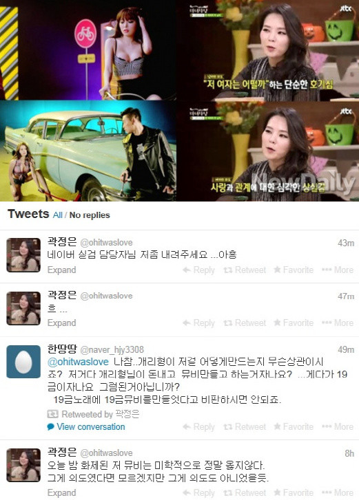 앞서 곽정은은 트위터를 통해 “오늘 밤 화제된 저 뮤비는 미학적으로 정말 옳지 않다. 그게 의도였다면 모르겠지만 그게 의도도 아니었을 듯”이라는 글을 올렸다. 이는 개리의 ‘조금 이따 샤워해’ 뮤직비디오를 겨냥한 듯한 발언으로 이목을 집중시킨 것.