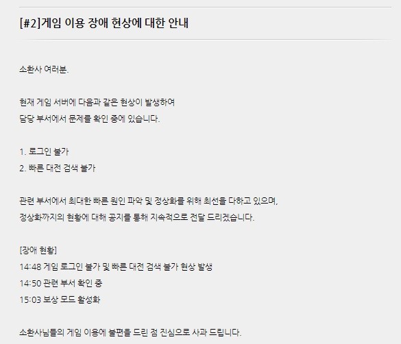 온라인 게임 리그 오브 레전드 서버가 마비돼 이용자들이 불편을 호소하고 있다.15일 오후 3시를 전후해 롤 서버가 알 수 없는 원인으로 마비돼 게입 접속이 원활히 되지 않고 있는 것으로 알려졌다.롤 서버를 담당하는 라리엇게임즈 코리아 측은 홈페이지를 통해 "현재 게임 서버에 로그인 불가 및 빠른 대전 검색 불가 현상이 발생해 담당 부서에서 문제를 확인하고 있다"고 설명했다.이어 "관련 부서에서 최대한 빠른 원인 파악 및 정상화를 위해 최선을 다하고 있으며 정상화까지의 현황에 대해 공지를 통해 지속적으로 전달해 드리겠다"고 덧붙였다.마지막으로 "이용자들의 게임 이용에 불편을 드린 점 진심으로 사과드린다"고 사과의 말을 전했다.롤 서버 마비 소식을 접한 네티즌들은 "한동안 잠잠하다 했다" "아 짜증나 !" "어쩐지 로그인 안되더라" "점검 빨리 해줘요" "얼른 얼른 짜증난다 진짜" 등의 반응을 보였다.[사진 출처=리그오브레전드 공식 홈페이지 캡처]