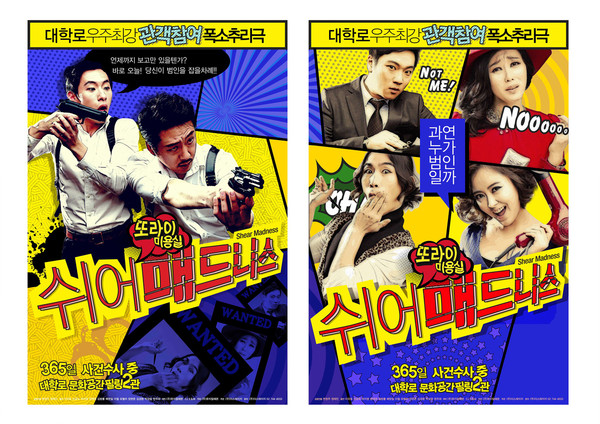 자칫 공존하기 힘들 것 같은 코미디와 추리극은 배우들의 번뜩이는 센스와 순발력, 그리고 관객들의 참여로 빛을 발한다. 미용실 안에 있는 네 명의 용의자 중 범인을 잡기 위해 형사들은 사건의 목격자인 관객들에게 도움을 요청하고, 형사들과 함께 사건을 되짚어 나가면서 관객은 어느새 단순한 관객이 아닌 <쉬어매드니스>의 또 하나의 배우로 활약한다.