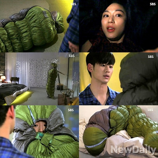 <별에서 온 그대> 전지현이 녹색 침낭에 갇혀 애벌레로 변신했다.지난 15일 방송된 SBS 수목드라마 <별에서 온 그대>(극본 박지은, 연출 장태유, 이하 별그대) 9회에서는 천송이(전지현)와 도민준(김수현)의 알콩달콩 사랑싸움이 그려졌다.